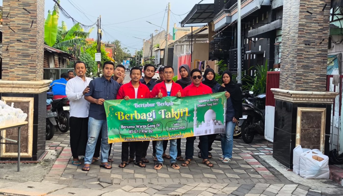 suararakyatjatim.com – Warga Tambak Medokan Ayu, gang IV, RT 7 RW 2, Kelurahan Medokan Ayu, Kecamatan Rungkut, Surabaya, menggelar kegiatan bakti sosial (baksos) dengan membagikan ratusan takjil kepada pengguna pada Bulan Suci Ramadan 2026, Sabtu (14/3/2026) sore.